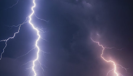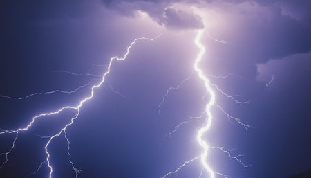 A striking image of lightning illuminating dark storm clouds at dusk, capturing the raw energy and beauty of nature during a powerful thunderstorm.