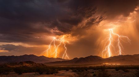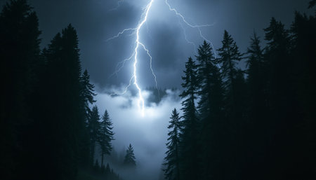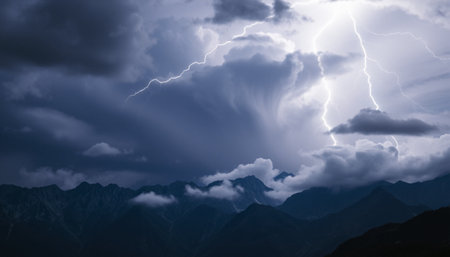 A breathtaking view of a lightning bolt striking the mountains during a thunderstorm, showcasing the raw power of nature with dark storm clouds and illuminated landscape.