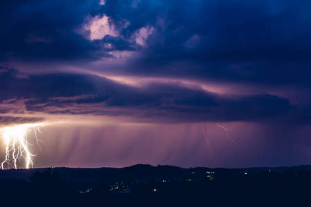 Dark stormy sky with lightning strikes and thunderstorm clouds at night. Dramatic, nature, danger, weather and atmosphere concept