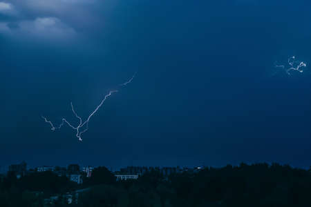 Lightning storm over the city at the summer heavy rain. Dramatic, breathtaking atmospheric natural phenomenon. Left bank outskirts of Kyiv, Ukraine.