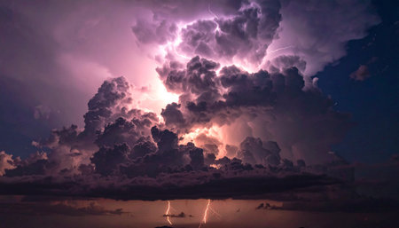Majestic storm clouds illuminated by lightning create dramatic night sky filled with stars. scene captures beauty and power of nature, evoking sense of awe and wonder