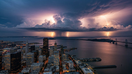 A aerial view of the San Francisco skyline under a dramatic and intense lightning storm. Massive, dark storm clouds dominate the sky, illuminated by powerful bolts of lightning that streak across the horizon. The San Francisco Bay is visible, reflecting the stormy sky and the distant lights of the city. The iconic Bay Bridge can be seen in the distance, silhouetted against the dramatic weather. The scene is moody and awe-inspiring, showcasing the raw power of nature juxtaposed with the urban...