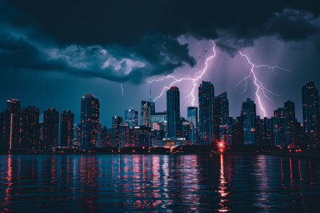 Lightning bolts light up the dark sky as a city skyline stands tall in the background. The reflection on the water adds to the dramatic atmosphere of the nighttime scene.
