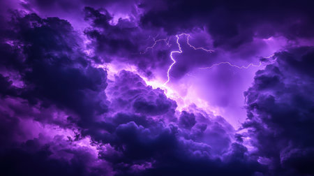 Close-up of a vivid lightning strike branching across a dramatic purple sky, highlighting the power and energy of a thunderstorm. The abstract composition emphasizes the electric lines.