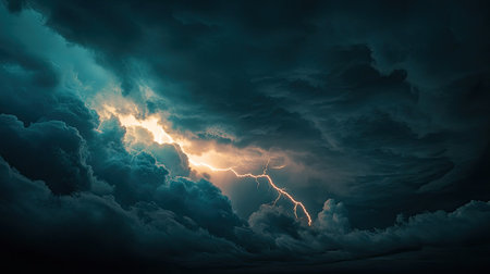 A stunning display of nature's power, this image captures a tumultuous storm with bright lightning flashing against dark, ominous clouds, creating a surreal landscape.