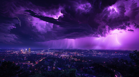 A high vantage point overlooking a city as it's enveloped in the majesty of a purple-lit storm, the electricity in the air palpable.