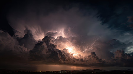 AI Generated. A dramatic thunderstorm scene, with lightning illuminating the dark clouds and landscape below, capturing the powerful energy of nature