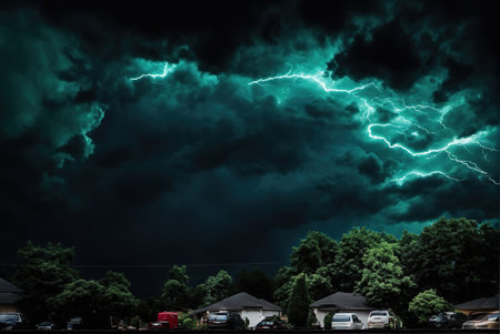 Gloomy heavy rainstorm weather lightning strikes outdoors and village