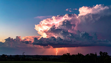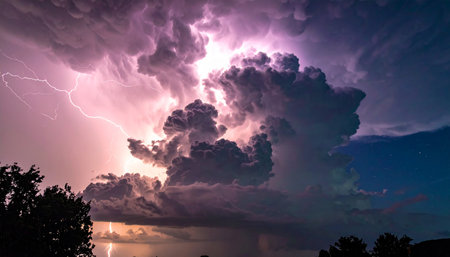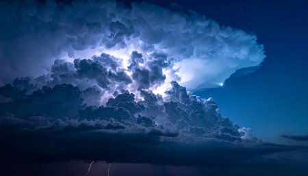 Majestic storm clouds illuminated by lightning create dramatic night sky filled with stars. scene captures beauty and power of nature, evoking sense of awe and wonder