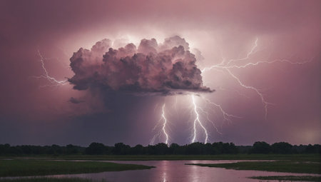 AI Generated. A dramatic thunderstorm scene, with lightning illuminating the dark clouds and landscape below, capturing the powerful energy of nature