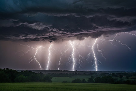 Dramatic lightning bolts illuminate a stormy sky above a field and treeline with heavy dark clouds and rainfall This image is perfect for weather reports and dramatic nature scenes.
