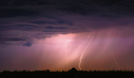 Lightning strike over a field in the countryside. Thunderstorm.