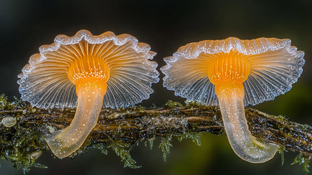 Two mushrooms with orange caps and stems, translucent, with a delicate, ruffled edge. The gills are visible. The stems are curved.