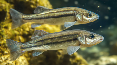 Two slender fish glide through clear water, surrounded by rocks. Sunlight filters down, casting a serene glow over the aquatic scene, highlighting their movements and natural beauty.