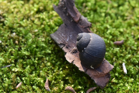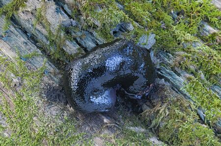 Close up selective focus. A huge snail crawling on a wet stone slope covered with colored lichen. Relict forest on the slopes of the oldest Anaga Natural Park on Tenerife. Paradise for hiking. Canary.