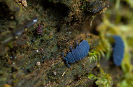 A blue pill bug crawls along the surface of decaying wood surrounded by vibrant green moss in a natural forest habitat under soft daylight conditions.
