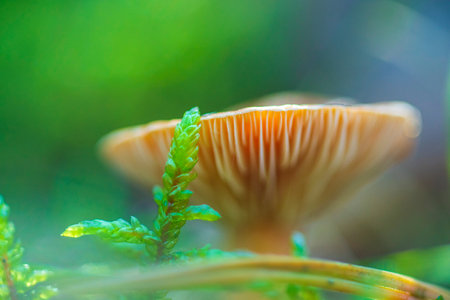 A stunning close-up of a vibrant mushroom showcasing its glowing gills. This colorful fungus highlights the beauty of nature in a serene forest setting, perfect for nature lovers and biology enthusiasts.