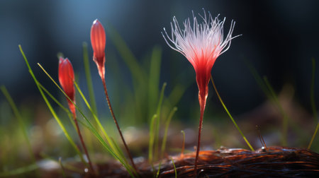 Close-up of coral-like flowers growing on the ground, with numerous corals in various shapes and colors. The petals have small dots that resemble dewdrops. This is an award-winning photo taken with a Sony A7R IV camera. It was shot from low angles using macro lenses, creating a dreamy atmosphere. In the background, there were various mosses, as well as other unique plants. --ar 53:30 --v 6.1 Job ID: 516d3a1a-9c37-4dc3-921f-11d8f4dc1826