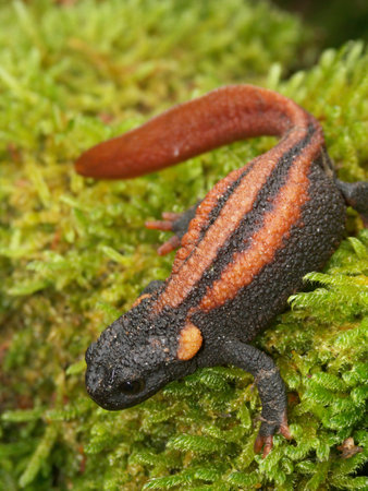 Detailed vertical closeup on a gorgeous endangered Chinese Red-tailed Knobby Newt , Tylototriton kweichowensis