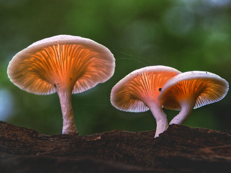 Cluster of mushrooms with delicate caps growing on a mossy log, their shapes and textures highlighted in soft natural light