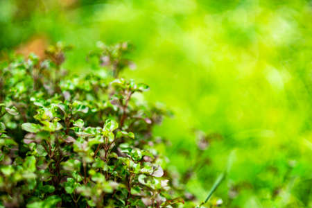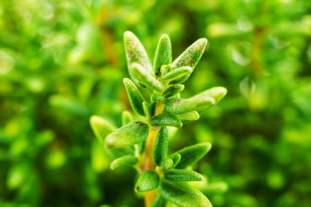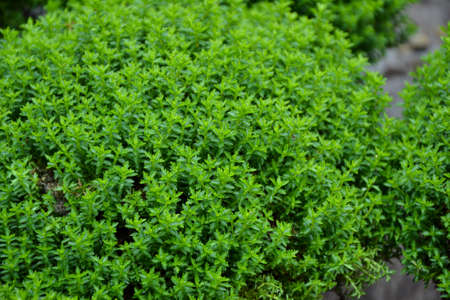 Thyme or Thymus vulgaris - perennial herb with tiny aromatic leaves. Macro image of fresh green thyme growing outdoors in the garden, selective focus.