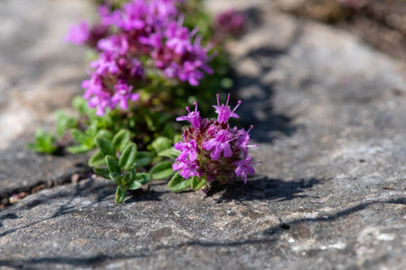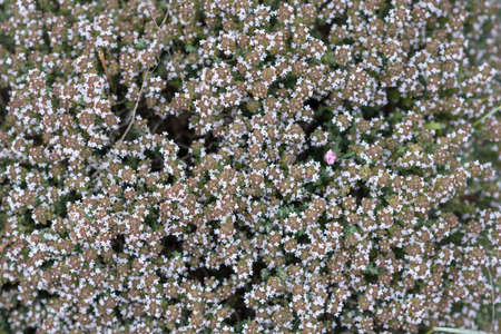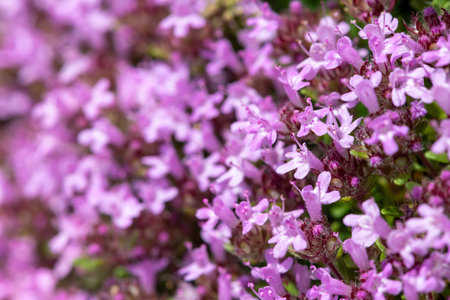 Common thyme (lat. Thymus vulgaris) or creeping thyme close-up. Selective focus