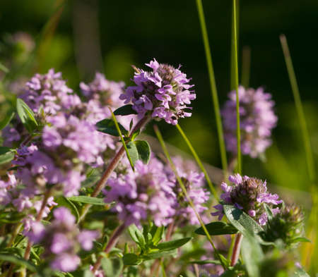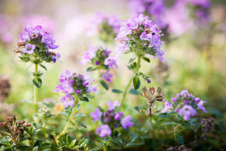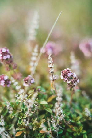 Close up of wild thyme flowers in the field. Selective focus.