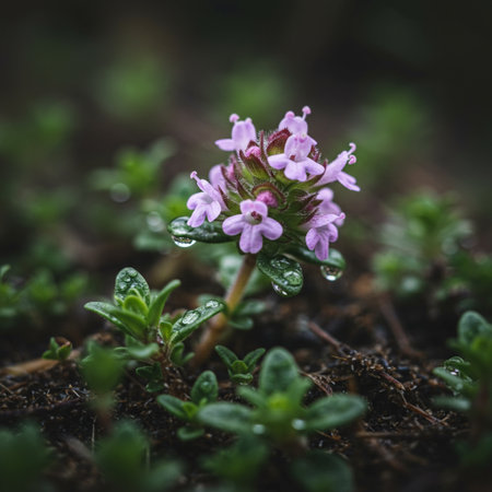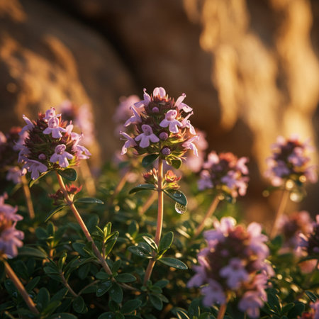 Clusters of delicate pink-purple flowers bloom on wild thyme releasing a sweet aroma amidst lush green foliage under the warm sun in spring.