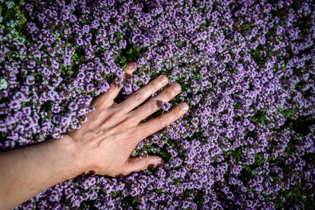 Man touches green fresh aromatic Thymus vulgaris plant, hand closeup