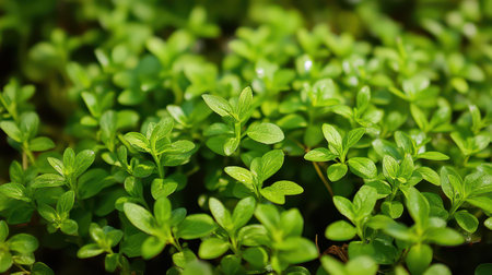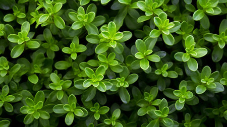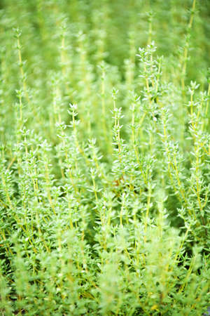 Background of fresh thyme growing in a garden for use as a culinary potherb to season and flavor savory cooking.