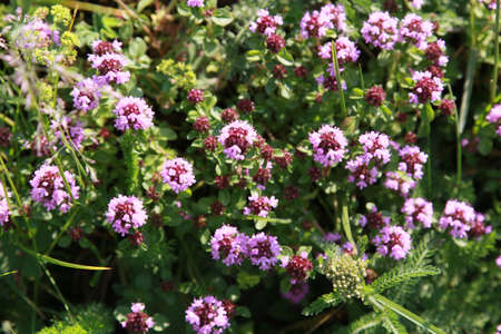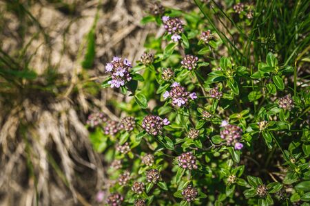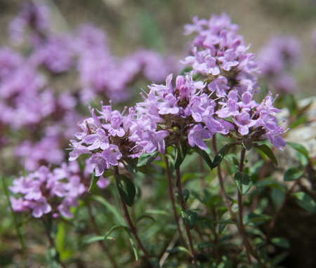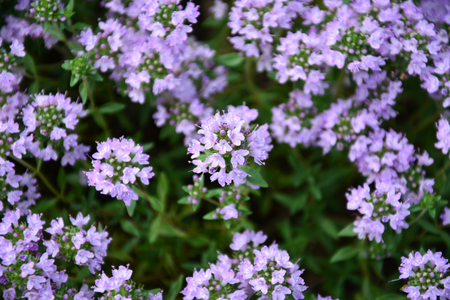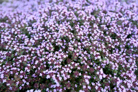 Small purple flowers natural background. Thyme herb blossoming