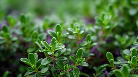 Detailed macro shot showcasing the texture and vibrant green leaves of a thyme herb plant. Soft background enhances the focus on the intricate details of the herb.
