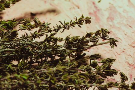 Thyme sprigs, close up. Twigs of thymus serpyllum.