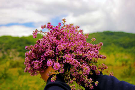 Bush flowering thyme in the mountains. Medicinal plants, background of pink flowers. Ethnoscience.