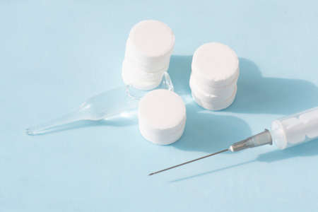 tablets, ampoule, syringe on a blue background. A vaccine against the virus.