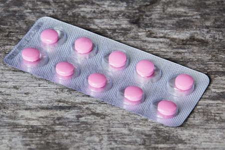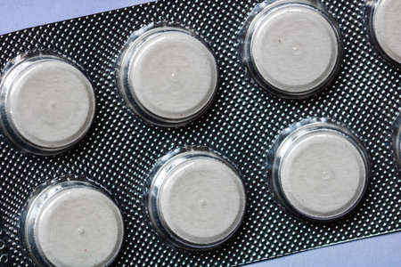 Blister package with Vitamin on color background. Medicine pills on a light background. Medicines and prescription pills flat lay background. blue medical tablets in blister.