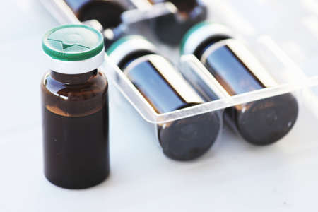 Abstract medical background, an ampoules with pink liquid. Vaccine in bottles background.