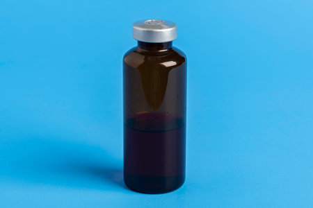 A macro shot with selective focus of an amber color vaccine injection bottle set on a plain blue background.