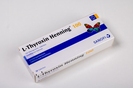 Neckargemuend, Germany: October 06, 2021: Packaging of the prescription drug L-Thyroxin Henning, a Levothyroxine preparation is a manufactured form of the thyroid hormone thyroxine in the dosage 100mg.
