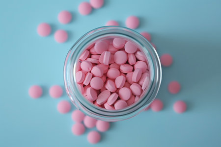A jar of pink pills is on a blue background. The pills are scattered around the jar, creating a sense of disorder and chaos. The pink color of the pills contrasts with the blue background