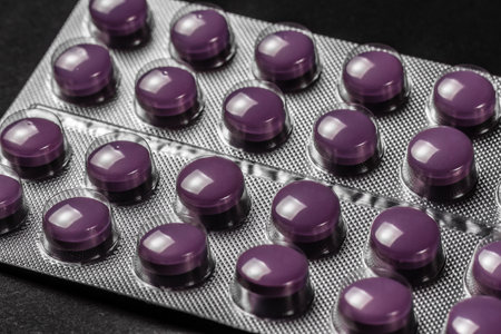 Medication concept. Diclofenac use for relief pain and reduce muscle inflammation. Many violet pills isolated on white background, selective focus and copy space.