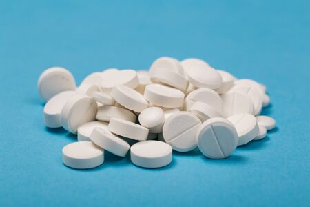 Pharmacy theme. white different Pills and Capsules on the blue Surface. Closeup