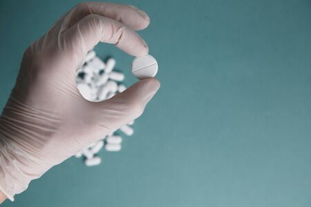 White tablets on a blue background are isolated. Layout of Flatley tablets. Gloved hand with a pill. Virus protection and 2019-ncov.