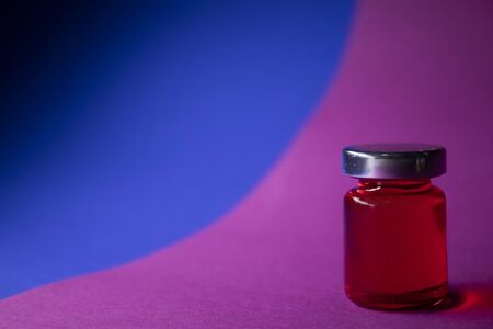 Little bottle with red liquid on blue-pink background. Isolated. Board games. Cure - medicine, vaccine. Coronavirus or covid-19 - pandemic. High quality photo