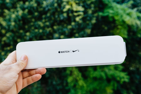 Paris, France - Spe 12, 2019: POV man hand holding against green background new Apple Nike watch sport loop band