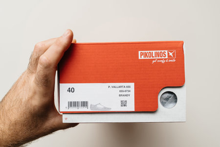 Paris, France - May 29, 2024: A male hand holds red Pikolinos shoes featuring the Get Comfy and Smile logo and slogan. The shoes are modeled on a Stier Vallarta 655 in brandy color, set against a white background.