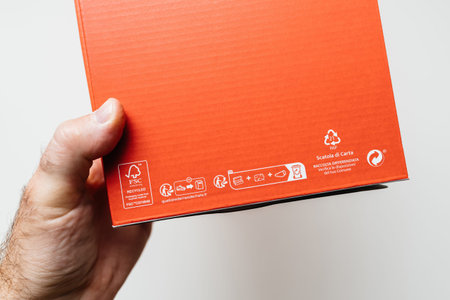 Paris, France - May 29, 2024: A hand holds an orange cardboard box, focusing on its recycling and FSC certification symbols. The boxs surface includes instructions for proper disposal and environmental information in multiple languages