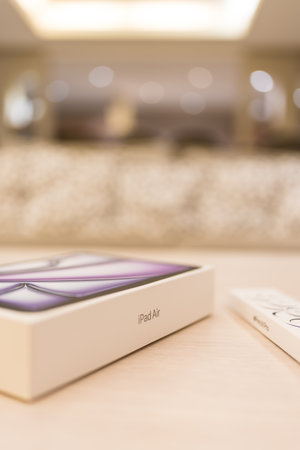 Bangkok, Thailand - July 19, 2024 : Brand new Apple iPad Air 11, 2024 version, and Apple Pencil pro during the in packaging. iPad Air space gray