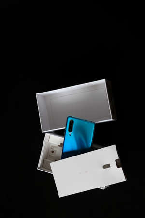 Top view of a new, just unpacked, mobile phone with multiple cameras in a white box on a black table.