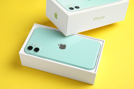 MYKOLAIV, UKRAINE - JULY 10, 2020: New modern Iphone 11 Green in original box on yellow background